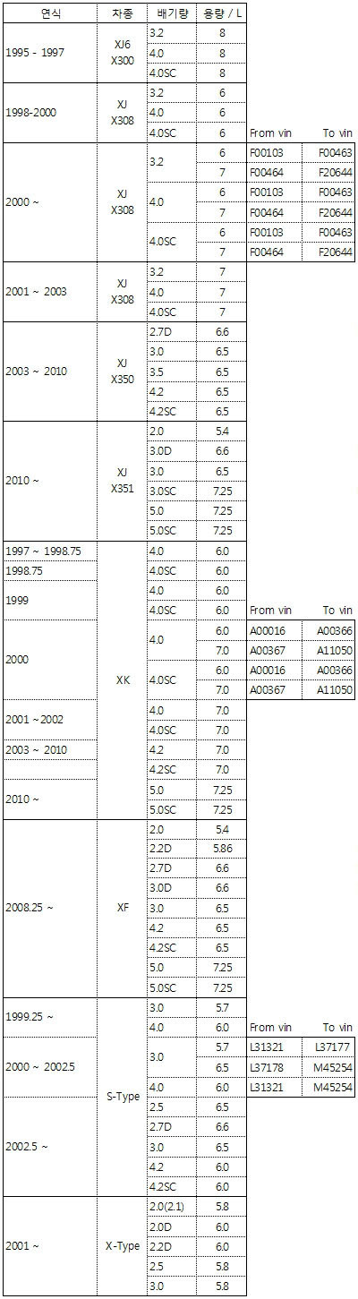 엔진오일 x 6L 또는 7L / 차대번호 확인 후, 아래 표 참조하세요.